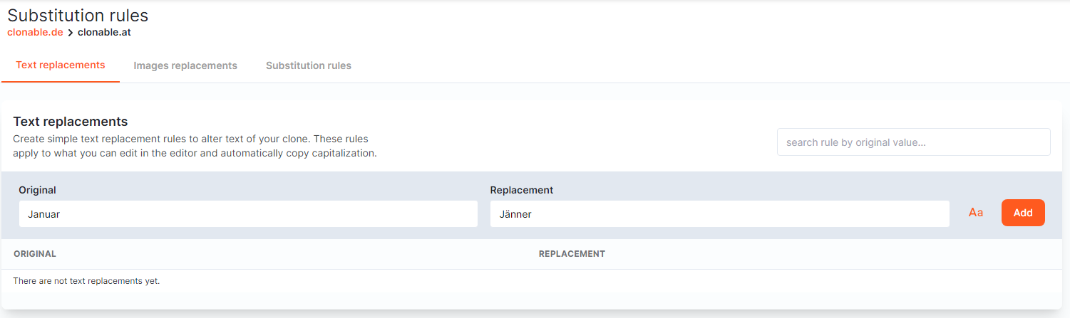 Met Clonable heeft u lokalisatie zo onder de knie. Neem het genoemde voorbeeld met Oostenrijk. U pakt een Duitse website, en cloont die naar een Oostenrijks domein. Vervolgens vervangt u Duitse woorden door hun Oostenrijkse tegenhangers, zoals ‘Januar’ vervangen door ‘Jänner’. Dit vervangen kan d.m.v. substitutions. U voert het te vervangen woord in onder ‘original’. Het vervangende woord vult u in onder ‘Replacement’. Dan tikt u ‘case insensitive’ aan als u de hoofdletters wilt negeren bij het vervangen.