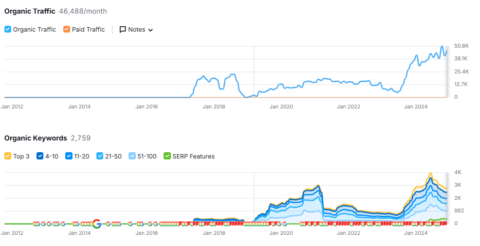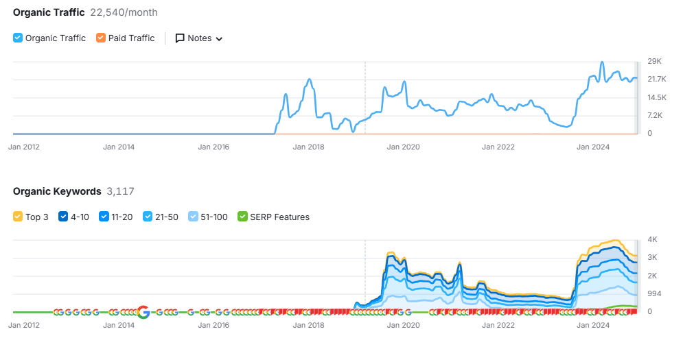 Het is natuurlijk niet met zekerheid te zeggen of het werkelijke verkeer daadwerkelijk bijna vertienvoudigd is, zoals in Semrush lijkt. SEO-tools schatten verkeer op basis van zoekvolumes en rankings, en die kunnen soms afwijken. Maar één ding is duidelijk: het organische bereik en de zichtbaarheid zijn minstens verdubbeld, en dat binnen een paar maanden.
